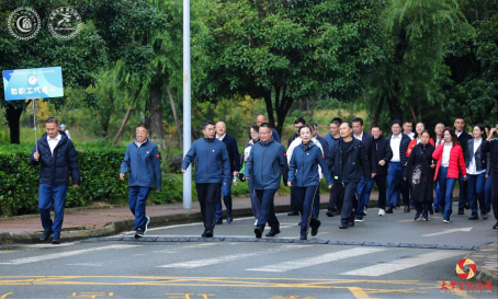 在健步走活动中,校领导们与全体教职工沿校园主要道路阔步前行,沿途绿意盎然,欢声笑语。