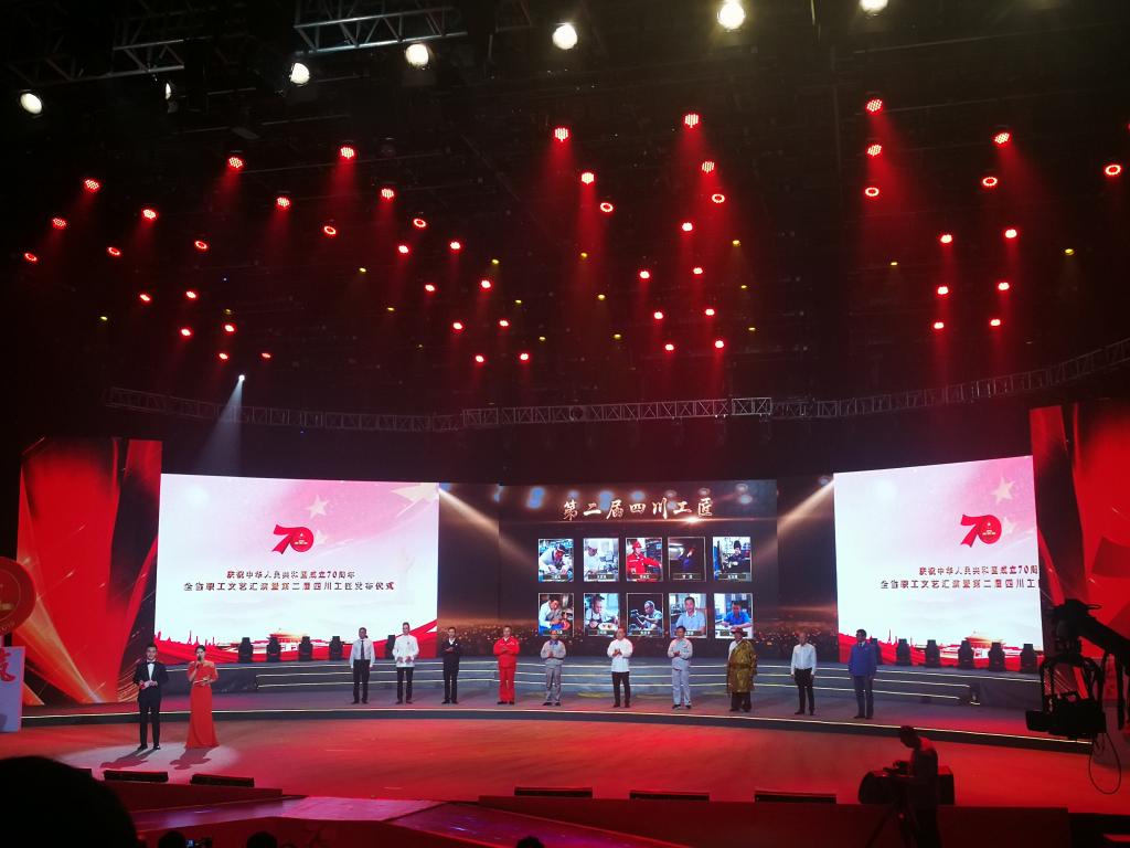 晚会现场,50位“四川工匠”迈过红毯,登上舞台,领取属于他们的荣耀。“光荣与传承、变革与奋进、使命与担当、梦想与征程”四个篇章贯穿文艺汇演始终,歌曲、舞蹈、四川清音、视频互动等精彩纷呈。我校文信学院教师杨柳青、川木表演的《咱们工人有力量》等歌曲和舞蹈在酷炫的舞台背景下雄壮、悦耳、激荡人心,压轴齐唱《我和我的祖国》,把全场气氛推向高潮,全省职工共同祝愿伟大祖国前程似锦。